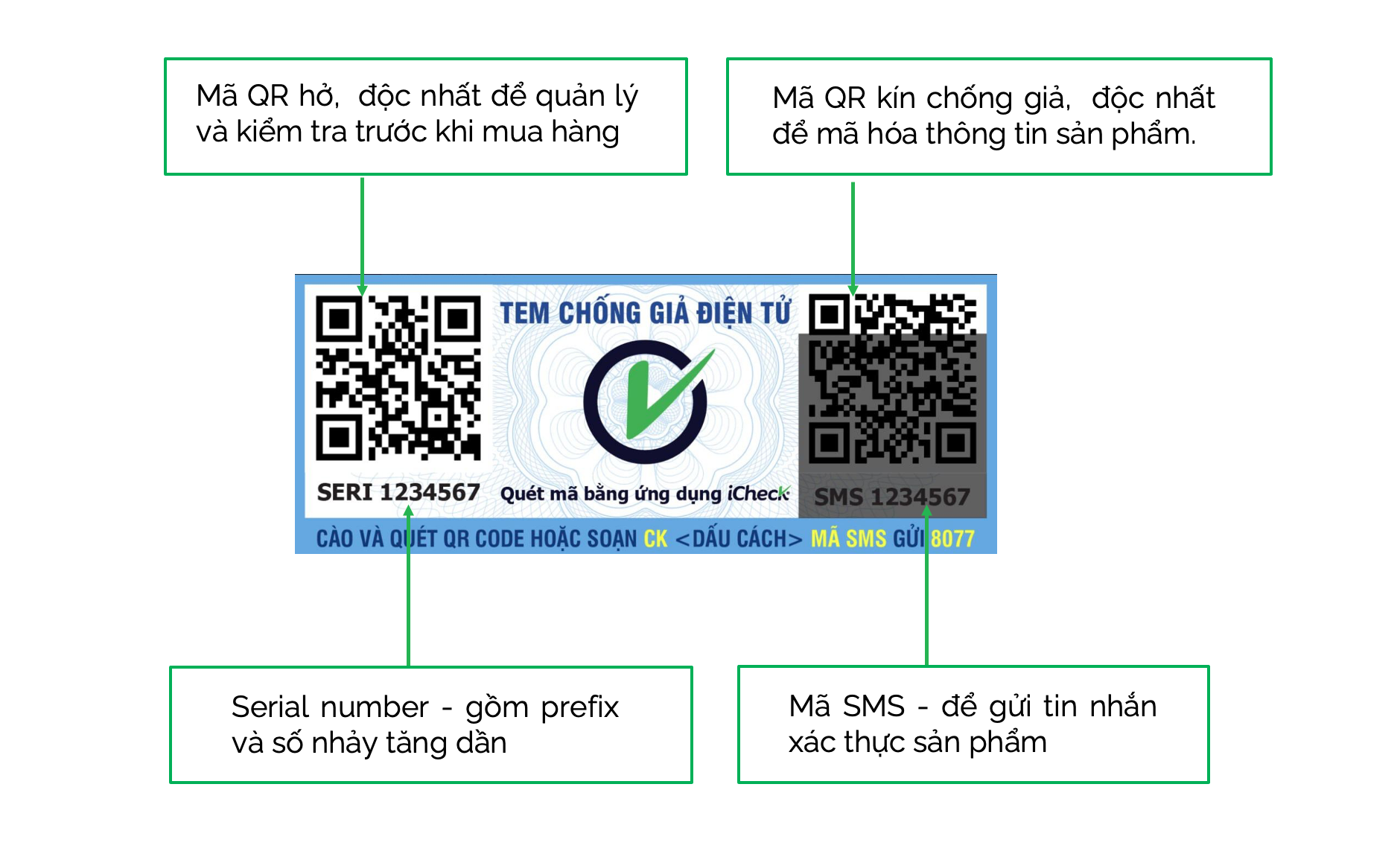 Tem SMS chống giả được in sẵn mã số hoặc mã cào, người dùng chỉ cần nhắn tin theo hướng dẫn qua tem SMS chống giả để kiểm tra nhanh tính chính hãng của sản phẩm.